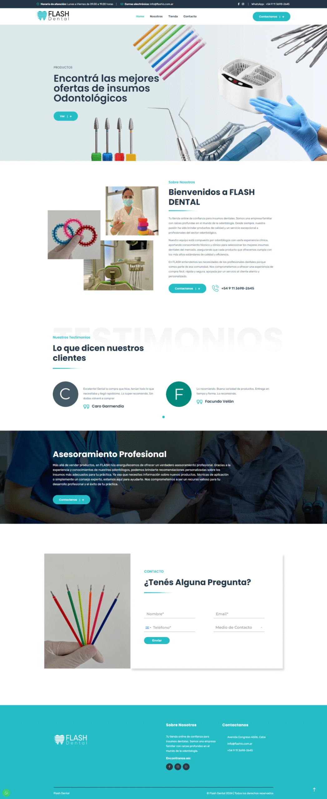 FLASH Dental opera en un mercado B2B (vendiendo a odontólogos), donde la confianza y el precio son clave. Necesitaban una web que no solo funcionara como una vidriera de e-commerce, sino que también resaltara su valor diferencial: el asesoramiento profesional brindado por odontólogos expertos.