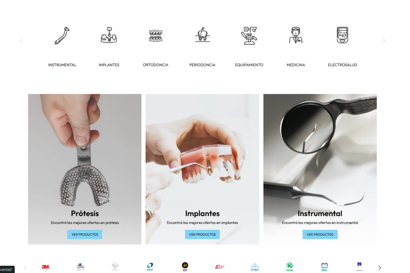 Organización de catálogo estratégica: Simplifiqué la navegación creando categorías clave en el menú y en la landing: Instrumental, Implantes, Ortodoncia, Periodoncia, Equipamiento, y Medicina/Electrosalud. Esto permite a los profesionales encontrar rápidamente los insumos de su especialidad.