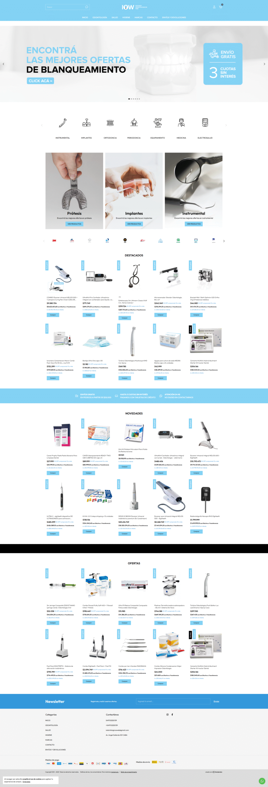 IOW vende una gran variedad de productos de alto valor y muy técnicos (instrumental, implantes, equipamiento, electrosalud). El desafío principal fue organizar este catálogo extenso y especializado en una interfaz intuitiva, moderna y que destacara las ofertas y los beneficios clave de la compra online. El diseño debía transmitir profesionalismo y facilitar la navegación de los odontólogos.